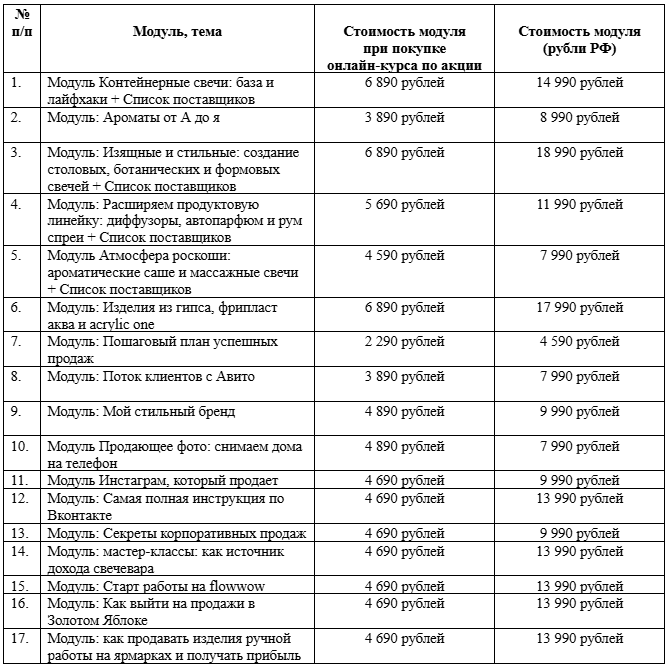 1.1. Стоимость каждого модуля онлайн-курса и групповых занятий: