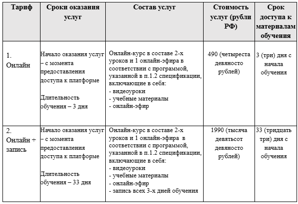 3.2. Подробное описание и объем услуг, в том числе состав онлайн-курса, его тарифы, стоимость обучения и сроки его проведения указаны на сайте и в спецификации.