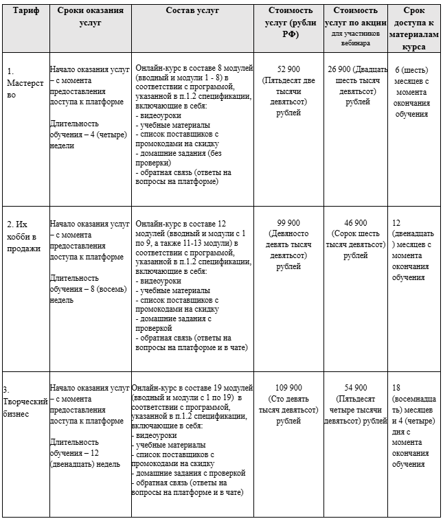 3.2. Подробное описание и объем услуг, в том числе состав онлайн-курса, его тарифы, стоимость обучения и сроки его проведения указаны на сайте и в спецификации.