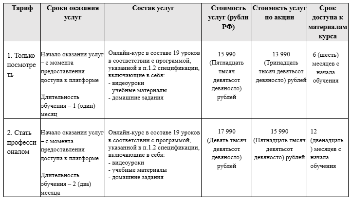 3.2. Подробное описание и объем услуг, в том числе состав онлайн-курса, его тарифы, стоимость обучения и сроки его проведения указаны на сайте и в спецификации.