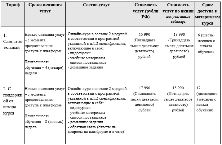 3.2. Подробное описание и объем услуг, в том числе состав онлайн-курса, его тарифы, стоимость обучения и сроки его проведения указаны на сайте и в спецификации.